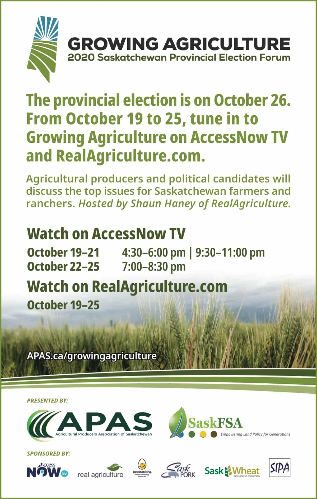 APAS, SaskFSA, and Access Communications are partnering to host Growing Agriculture: 2020 Saskatchewan Provincial Election Forum