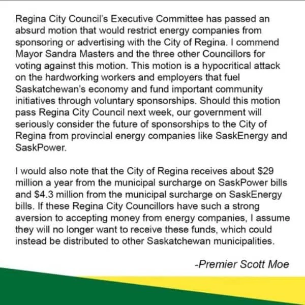 Moe posted on Facebook and Twitter: “Regina City Council’s Executive Committee has passed an absurd motion that would restrict energy companies from sponsoring or advertising with the City of Regina. I commend Mayor Sandra Masters and the three other councillors for voting against this motion.