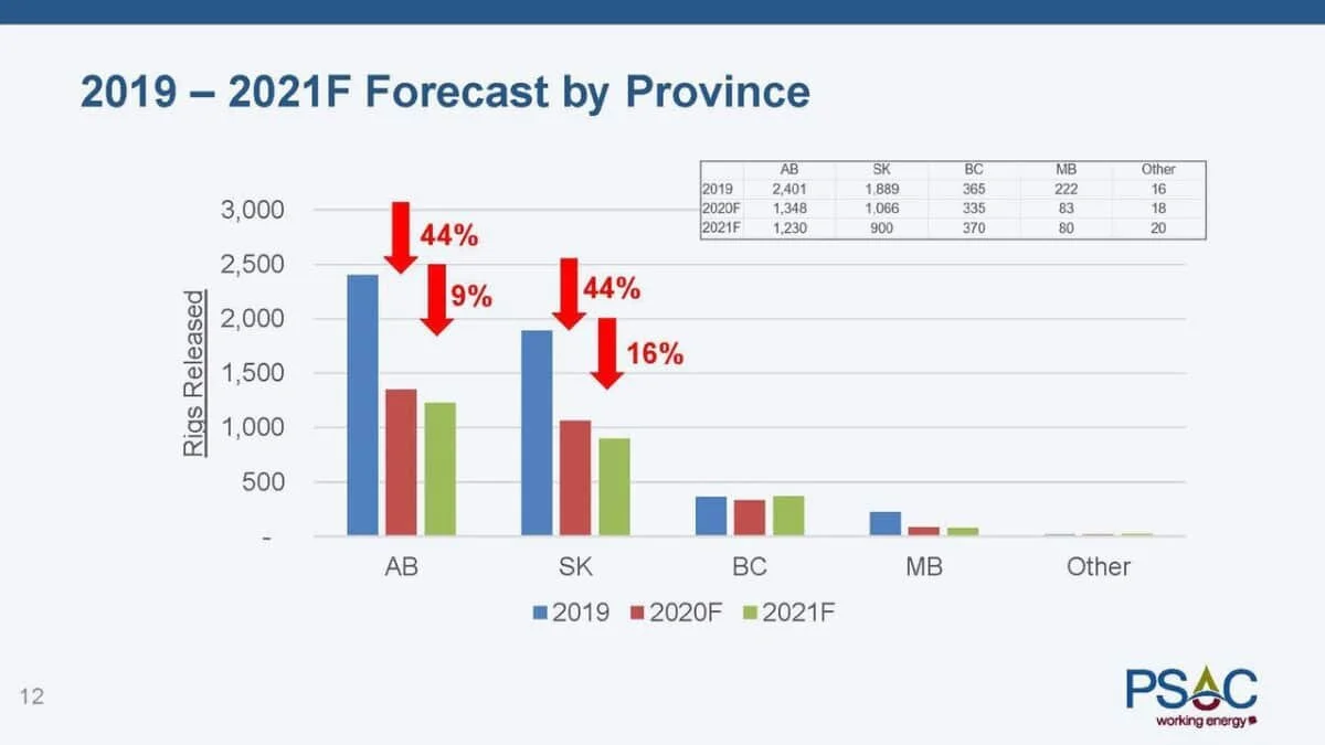 For Saskatchewan, there were 1,889 wells drilled in 2019. The forecast for 2020 is 1,066 wells, a decline of 44 per cent. Most of those wells had been drilled in the first quarter. For 2021, the forecast is just 900 wells, a decline of a further 16 per cent from an already devastating 2020. For reference, there were 3,665 wells drilled in Saskatchewan in 2014.