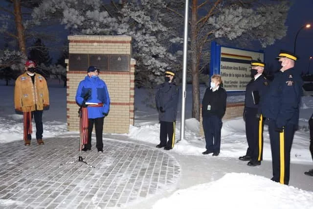 The flag raising ceremonies included prayers from Métis Nation – Saskatchewan Western Region 3 Regional Director Wendy Gervais in Regina and Elder Norman Fleury in Saskatoon as well as brief statements about the enduring relationship between Métis Nation – Saskatchewan and Saskatchewan RCMP.