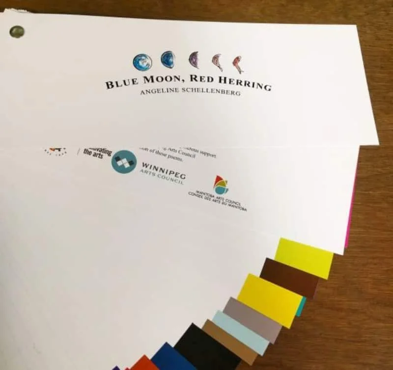 Clever, layered, original, fun. These words leap to mind after reading Winnipeg poet Angeline Schellenberg’s colourful limited-edition chapbook—bound to resemble a paint swatch—Blue Moon, Red Herring. Each of the twenty-five prose poems in this 2019 collection were inspired by a colour, and the colours themselves appear where a Contents page normally would. No need for titles when the paint-chip colours do the work, and each poem’s colour-matched with its sample. What results is candy—for the eye and the mind.