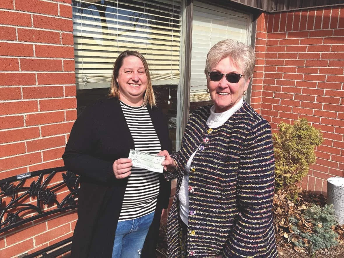 Myrna Hauta (right) representing the disbanded Kindersley branch of Superannuated Teachers of Saskatchewan, presents a donation of $1300 to Richie Nash (left), president of Eston Caring Hands.