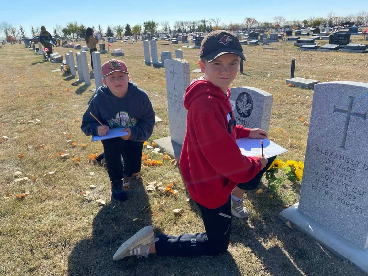 The Grade 6 students at Elizabeth Middle School recently paid a visit to the Kindersley Cemetery on October 8th, where they looked at the headstones of veterans. Their teacher, Maureen Dobbin divided the visit into three parts for her students.