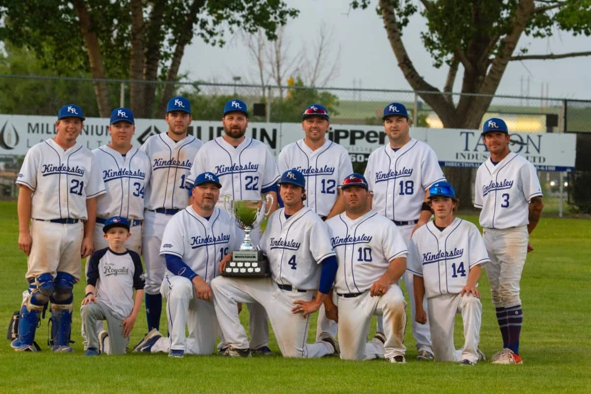The Kindersley Raiders defeated the Oyen Eagles in two straight games to claim the Fertile Valley Baseball Championship. Back row (L-R): Patrick Omness, Gage Misskey, Jesse Jamieson, Brady Bitz, Clayton Artymovich, Rob Andreas and Jeff Kosolofski. Front row: Travis Longmire (bat boy), Byron Ismond, Tyler McKee and Trey Tuffs.