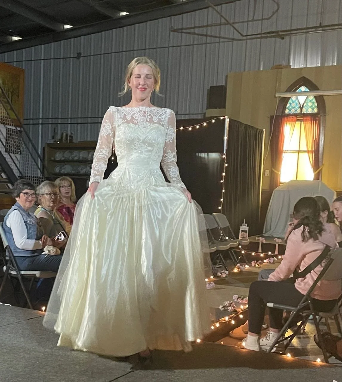 Arianna walked down the runway wearing the dress Linda Pincemin had worn on her wedding day on April 6, 1974, when she married Walter Sullivan. There was a huge spring blizzard that day, and a lot of the guests didn’t make it to the wedding. The minister and priest laughed because half of the Walters family arrived late wearing their street clothes because they got stuck and had to leave their vehicles and good clothes back on the highway. The band also got stuck, and only half of the musicians made it to the wedding.