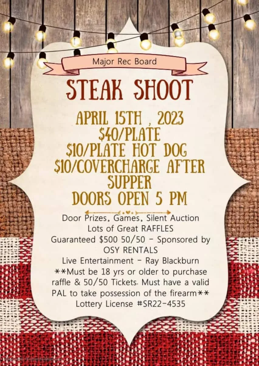 The Major Rec Board hosted a successful Steak Shoot on Saturday, April 15th at the Major Community Hall. Doors opened at 5:00 p.m., when guests were invited to partake of a delicious steak supper, complete with baked potato, Caesar salad and an ice cream bar for dessert. The hard-working volunteers from the Rec Board prepared the meal.