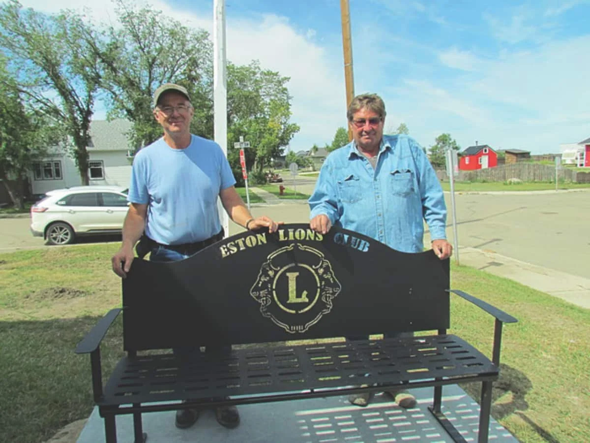 In line with its tradition of service to the community, the Eston Lions Club recently installed a bench outside the Eston post office; it will be available for people who wish to sit and rest or visit while getting their mail. Lions Ron Tessier, left, and Rodney Knight installed the bench which was manufactured by E & G Welding Ltd. at Glidden, Sask.