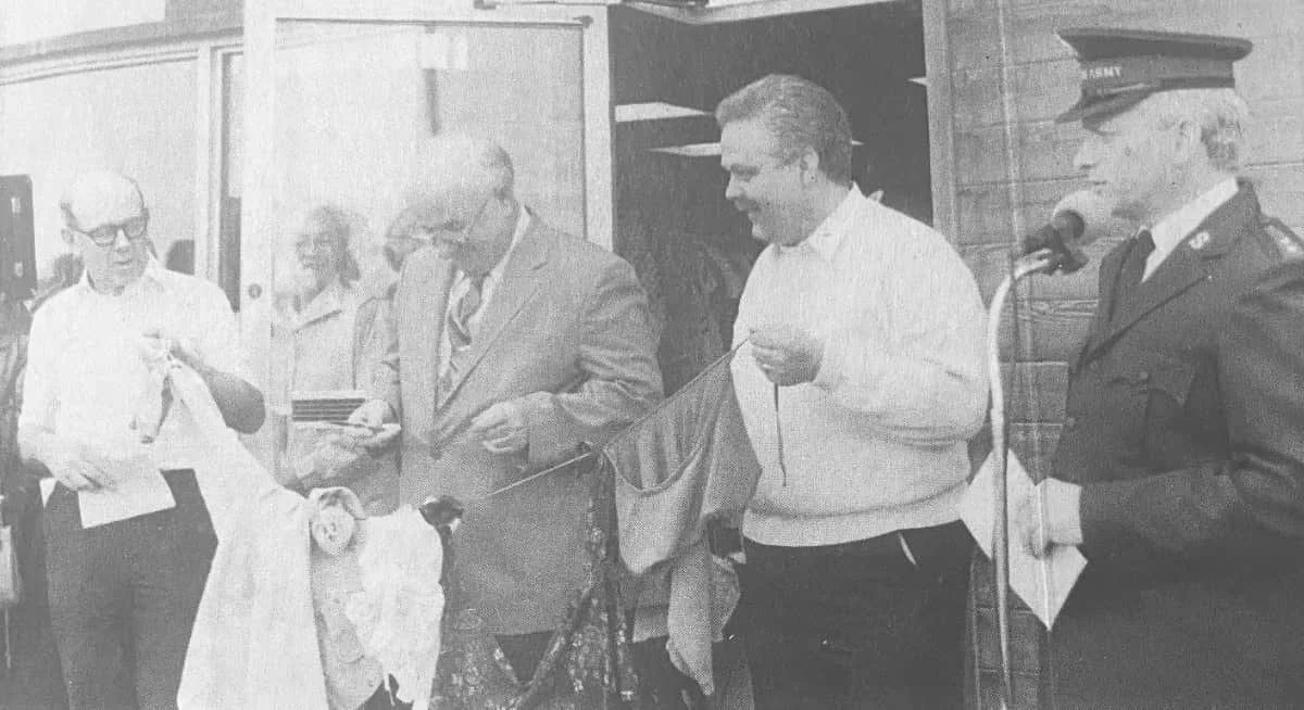 Mayor Archie Colton is about to cut the ribbon for the official opening of the Salvation Army Thrift Store, on April 22, 1989. Volunteers holding the ribbon of second hand clothes are Ron Lamont (l) and Barry Malindine (r). Captain Wilson Noble of the Salvation Army (far right) supervises. Photo: Kindersley Clarion, April 26, 1989