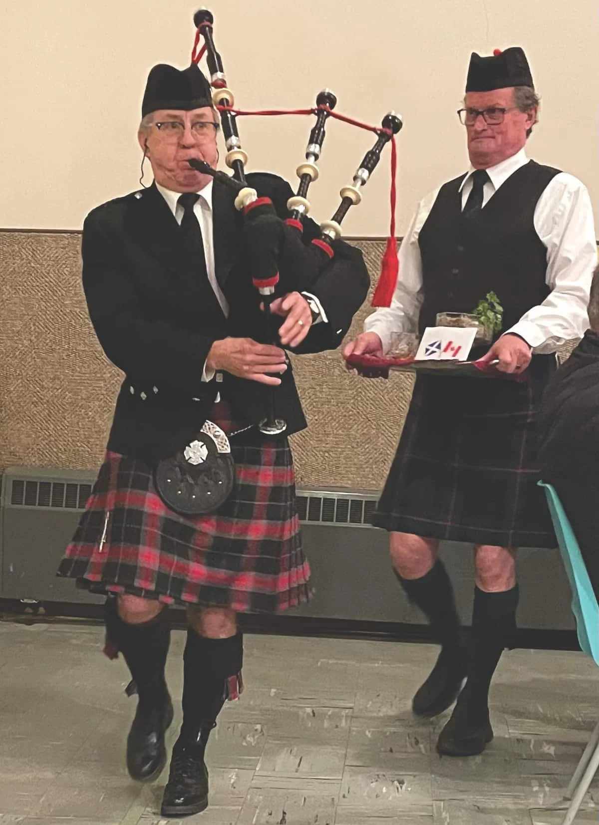 Cliff Jamieson piped in the Haggis, which was carried by Bob Watson at Robbie Burns Night at St. Paul’s United Church on January 25th. PHOTO BY JOAN JANZEN
