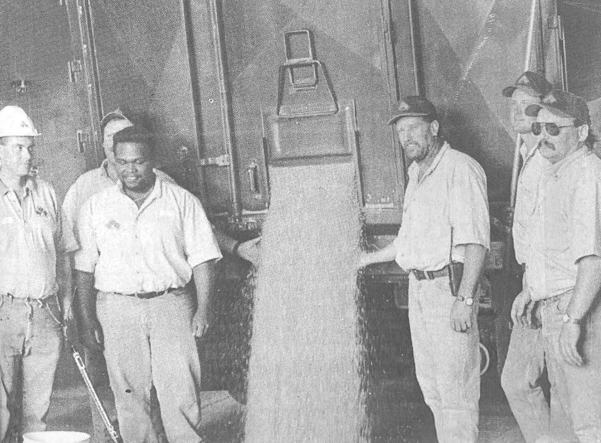 The staff at the Great Sandhills Terminal participated in the ceremonial grain loading at the GST’s offices opening in July, 1999. Photo West Central Crossroads July 19, 1999