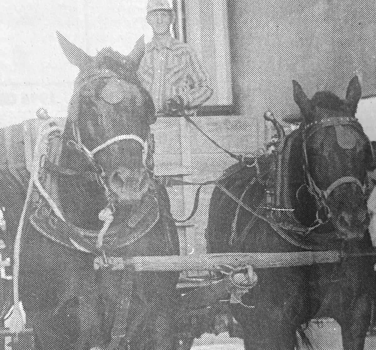 Harold Elsasser steers his horses through one of the loading bays at the GST opening ceremonies, July 13, 1999, showing how grain was first loaded by wagon. Photo West Central Crossroads July 19, 1999