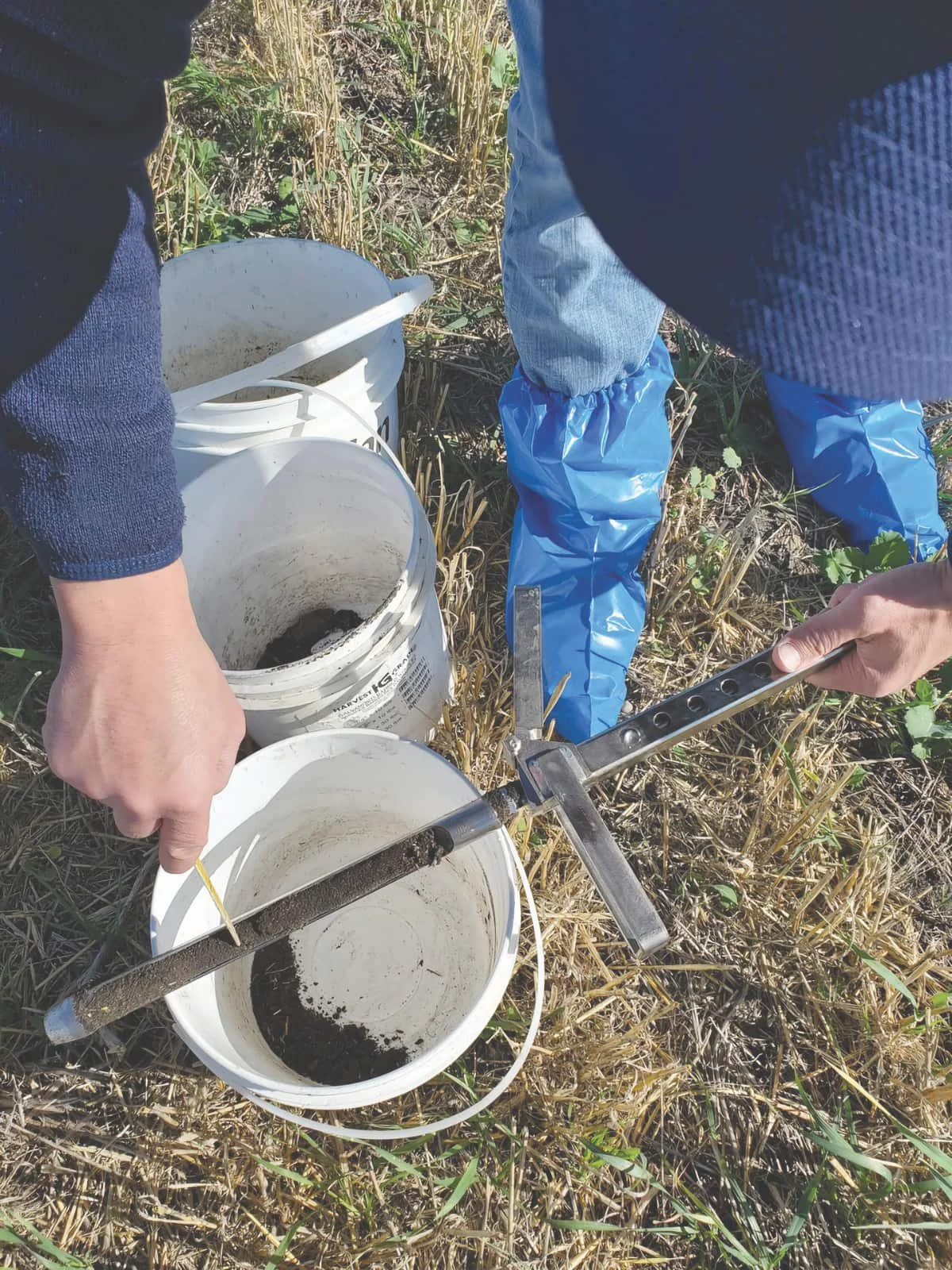 Divide each core into two or three soil depths and put them into separate pails. Have a pail each for 0-6” and 6-24” soil depths, or a three-way split of 0-6”, 6-12” and 12-24”.
