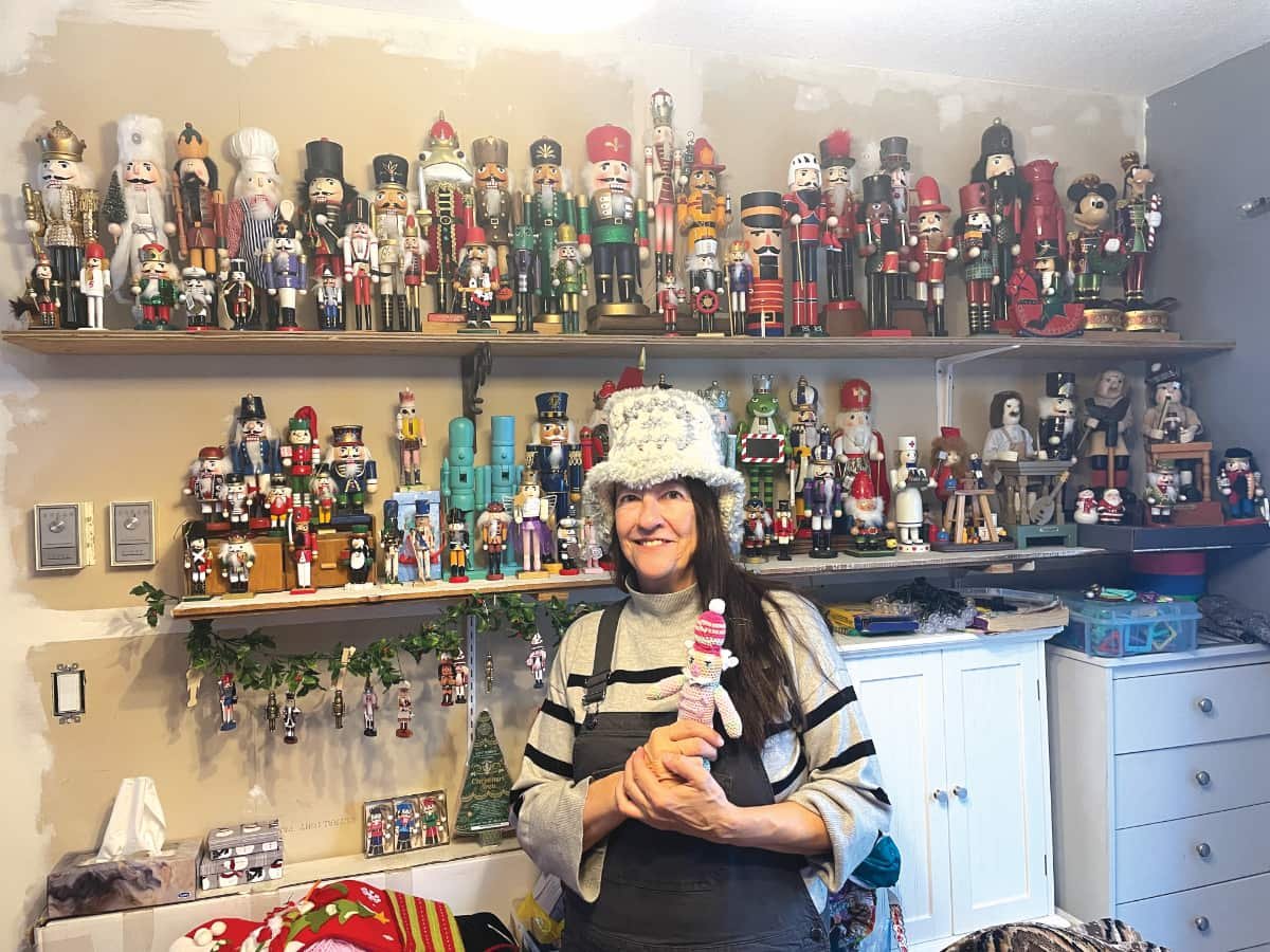 Rosi Housser stands in front of a small portion of the 900 Nutcracker figurines she has displayed in her home. She’s holding a nutcracker she crocheted. Photo by Joan Janzen