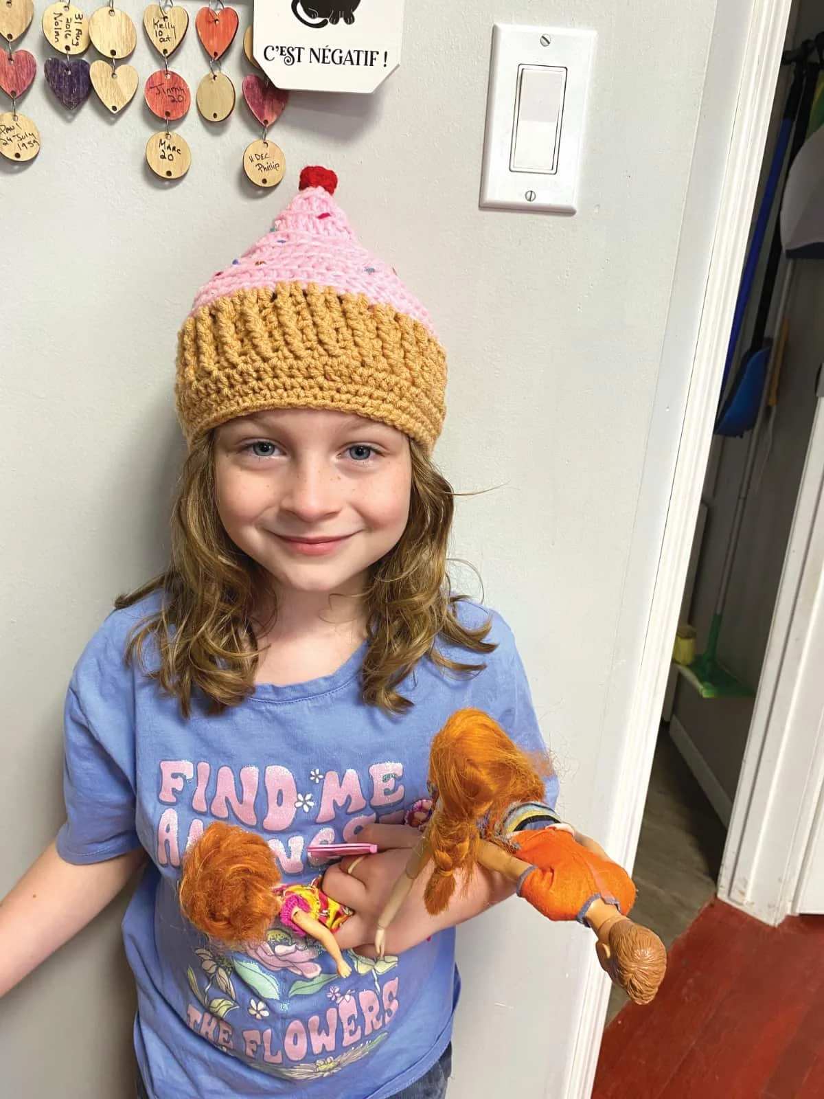 Rosi’s granddaughter proudly wears a crocheted cupcake hat her Grandma made for her. Photo by Rosi Housser