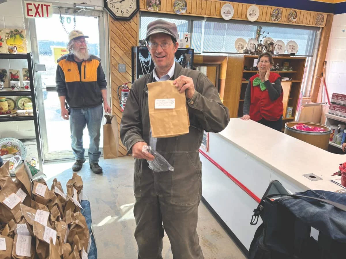 Bryan Ekelin (front) and Frank Kutschera receive surprise bags during the Kindersley Thrift Store’s Customer Appreciation Day on March 17, where staff served coffee, cookies and conversation. Manager Eddie Diehl said the event was a way to thank the roughly 100 customers the store serves daily. Nancy Klein is seen assisting customers.