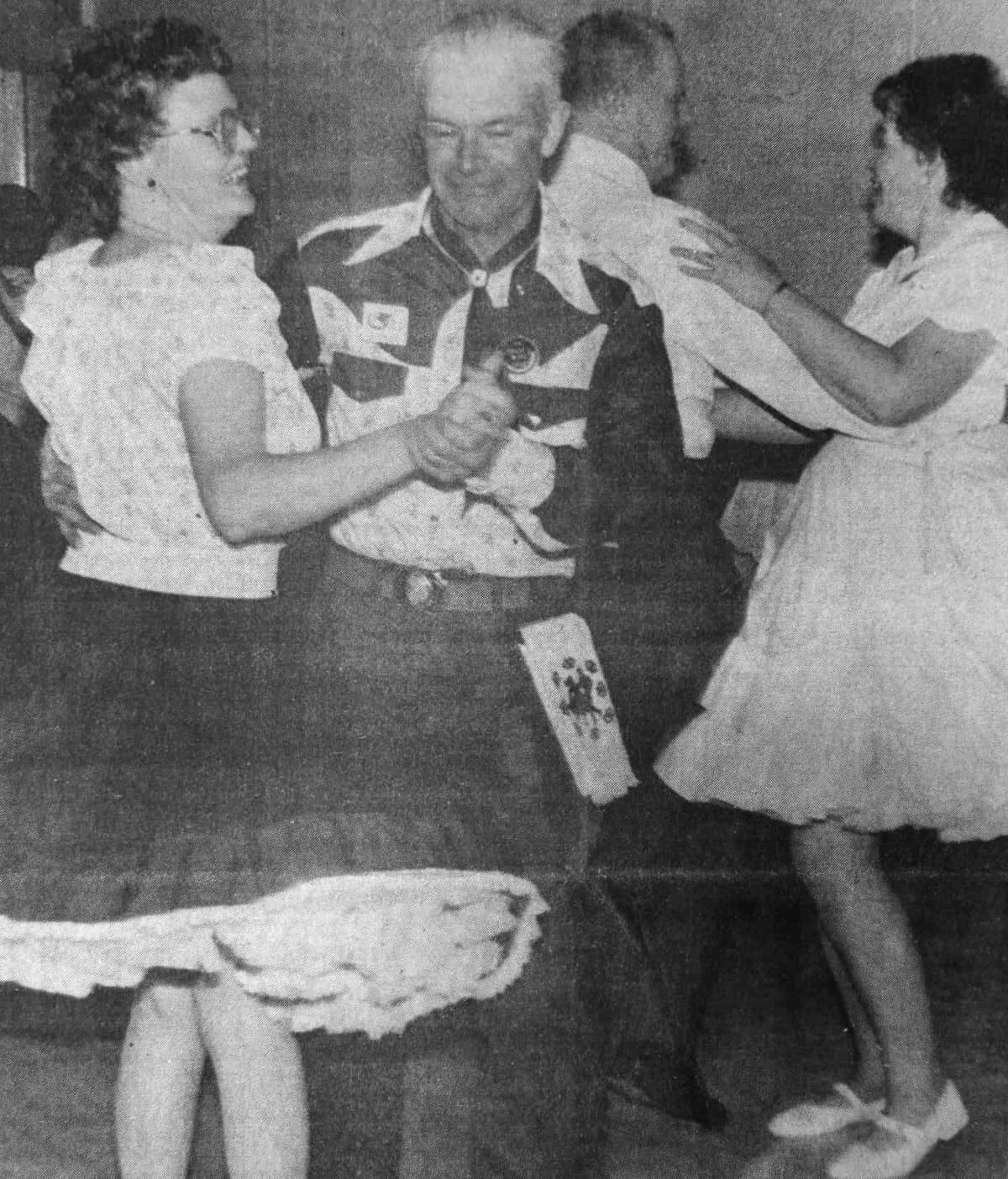 Connie and Bill Meek of Luseland (foreground) and Art and Jo Cortus of Dodsland promenade through the steps and turns of square dancing with the Whirls and Twirls Square Dance Club in Kindersley. In 1990, the club had 22 members—eight of whom had been part of the original Kindersley Square Dance Club when it began in 1957.