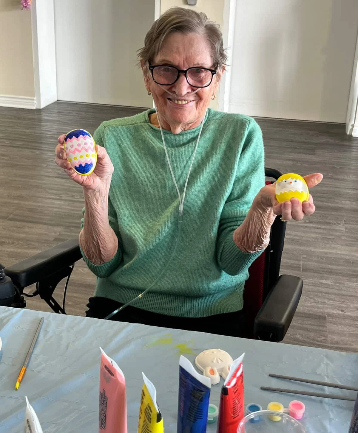 Easter Egg Creations! Bernie Witt, a resident at Caleb Village in Kindersley holds two of her Easter creations. SUBMITTED