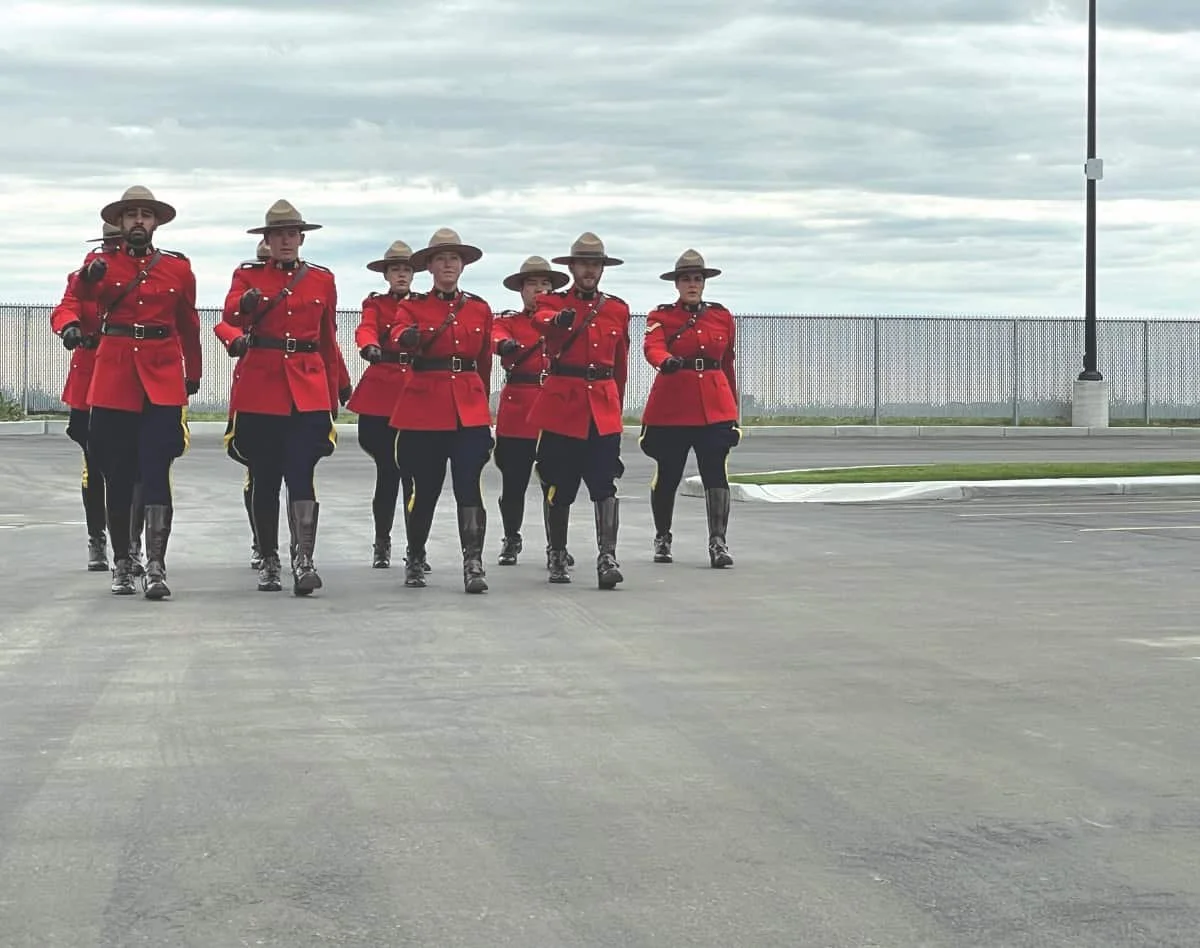 Kindersley Detachment members marched from the old detachment to the new one along with flag bearers from the Legion. The Canadian flag was then raised on the new flagpole. Photo by Joan Janzen