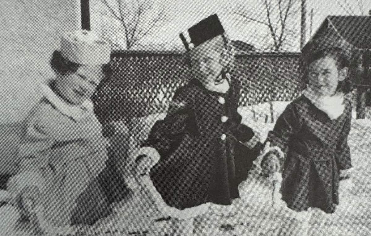 Grace Bomersine (William) was the first girl to own figure skates in Kerrobert. Since there were no teachers, she would go to the Sonja Henie movies and try to emulate her moves. About 1938 Grace formed a small class of ten-year-old girls. Three of the girls are in the photo: (L-R) Edna Sample, Kathleen Lynch, Barbara Shields.