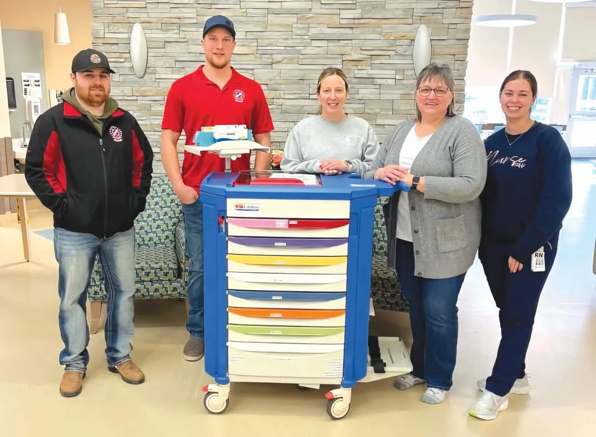 Representatives from the Kerrobert Kinsmen present a newly donated pediatric crash cart to staff at the Kerrobert Integrated Health Facility, strengthening emergency care for young patients. The donation highlights the continued commitment of local organizations to support health services in the community.