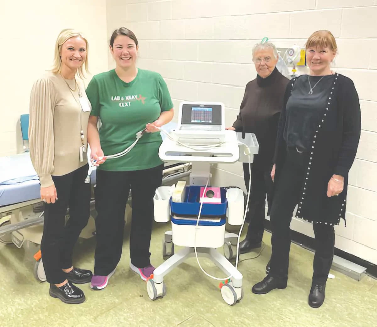 Thanks to Barry Wielgosz of Wielgosz Resources for donating $12,000 to purchase a new ECG 12 machine for the Kindersley Hospital Lab. The state-of-the-art ECG provides high-quality readings and advanced tools to support clinical decisions. It can detect irregular heartbeats, arrhythmias, heart attacks, and other cardiac abnormalities through a quick, noninvasive, and painless test. Left to right: Anika Becker, Clinical Manager, Kindersley Integrated Facility; Lilli Fries, CLXT (Combined Laboratory & X-Ray Technician); Viv Kalmer; and Colleen Sawchuk, Kindersley & District Health & Wellness Foundation.