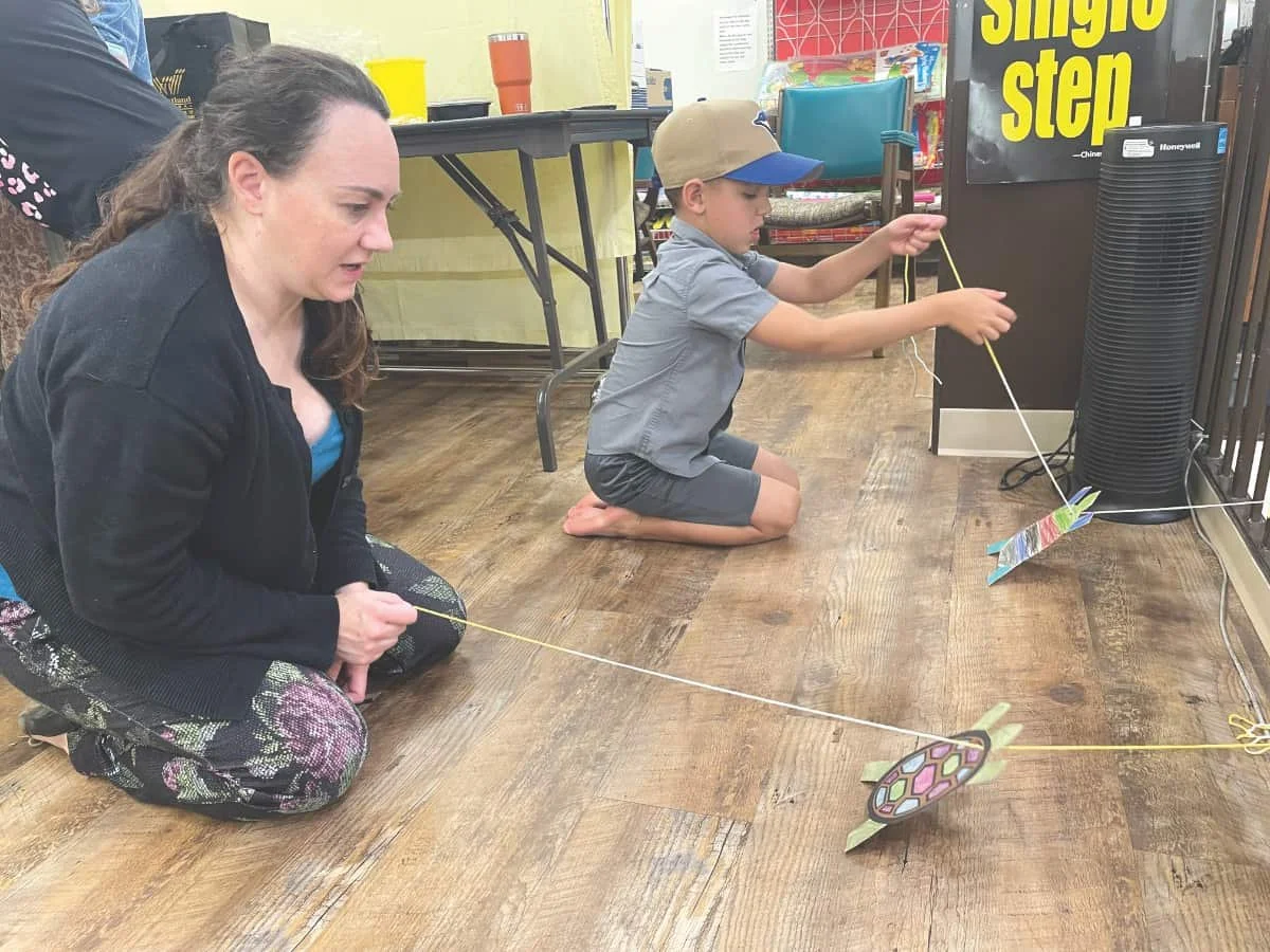 Librarian Molly had the youngsters colour and cut out cardboard turtles. When they were done, the racing turtles were attached to strings to test their speed in some fun races.
