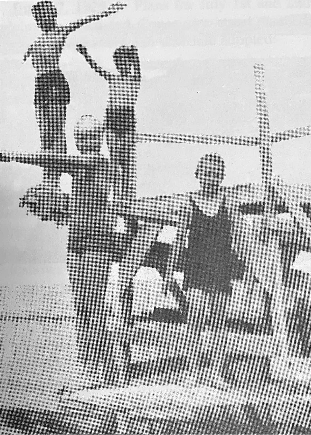 Back in the 1920s Tramping Lake Regional Park was a popular summer holiday destination. A 30’ x 70’ swimming pool was located on the east side of the lake. A pump, driven from a threshing machine belt and tractor (lent out from a neighbour) pumped water from the lake to the pool via pipe and trough. The pipe was taken down when the pool was full. The total cost to build the pool amounted to $700.00. The well-constructed diving platform at the Tramping Lake swimming pool was very popular. The kids on the diving board are: Lawrence Greer, Lloyd Bell, Ted Sample and Mary Greer.