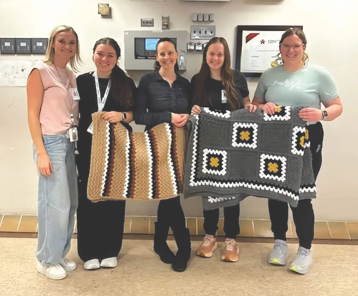 Anika Becker, Clinical Services Manager; Courtney Weenk, RN; Jessica Ross; Taryn Murphy, RN; and Adeline Hailbert, RN. “The Kindersley & District Health Facility extends a heartfelt thank you for the generous donation of handmade crochet blankets and quilts. This kindness will bring comfort and warmth to residents and patients when they need it most.” SUBMITTED