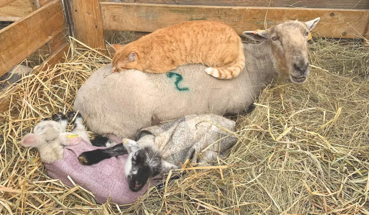 Spring may be slow to arrive, but lambing season is in full swing at Circle R Ranch, where the Rast family welcomed an extraordinary set of quintuplets. While one lamb did not survive at birth, five are thriving. Three remain with their mother, while the two smallest were brought inside overnight to stay warm in a hot box. Adding to the scene, a rescued feral cat has taken on an unexpected role, often curling up with the lambs — and even napping atop a ewe — for a shared bit of warmth in the barnyard.