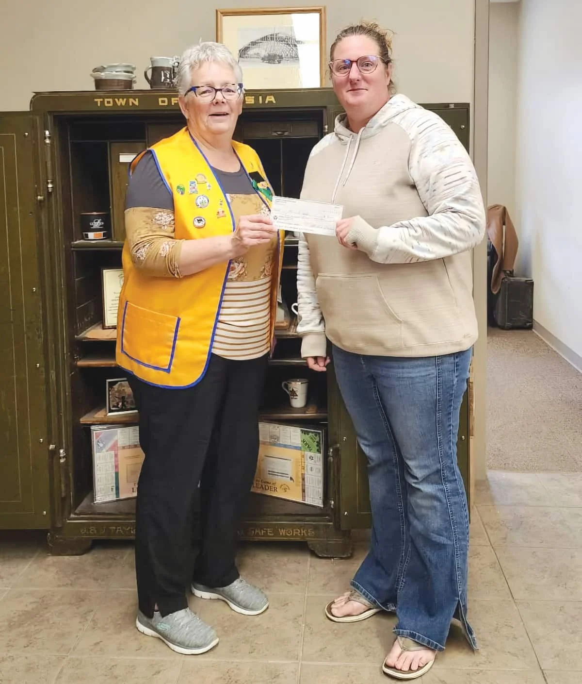 Lion President Lorie Andreas presents a $200 cheque from the Leader River Hills Lions Club to Town of Leader CAO Erin Romanuik in support of the Cemetery Tree Project.