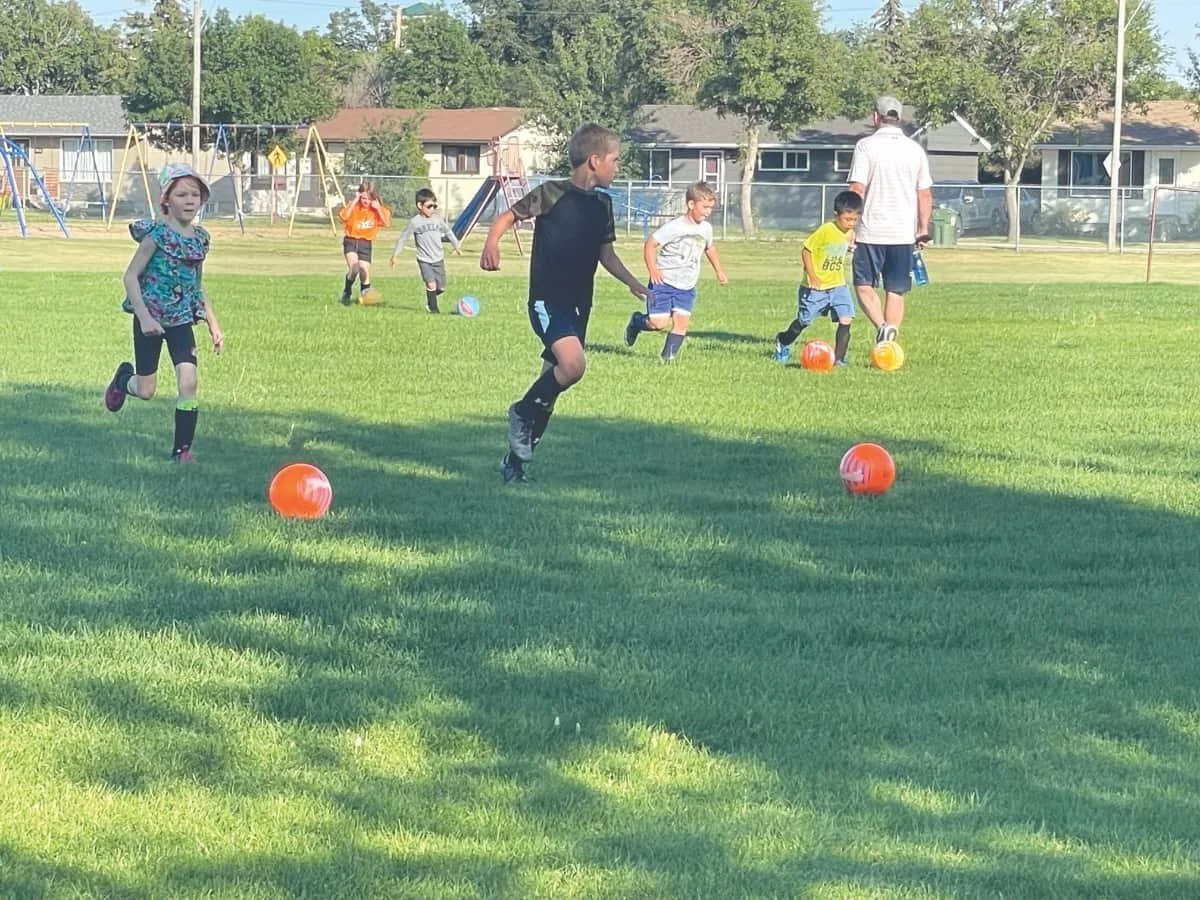 Young athletes enthusiastically participated in a four-week-long summer soccer clinic in Kindersley, which ended on Thursday, August 8th. PHOTO BY JOAN JANZEN