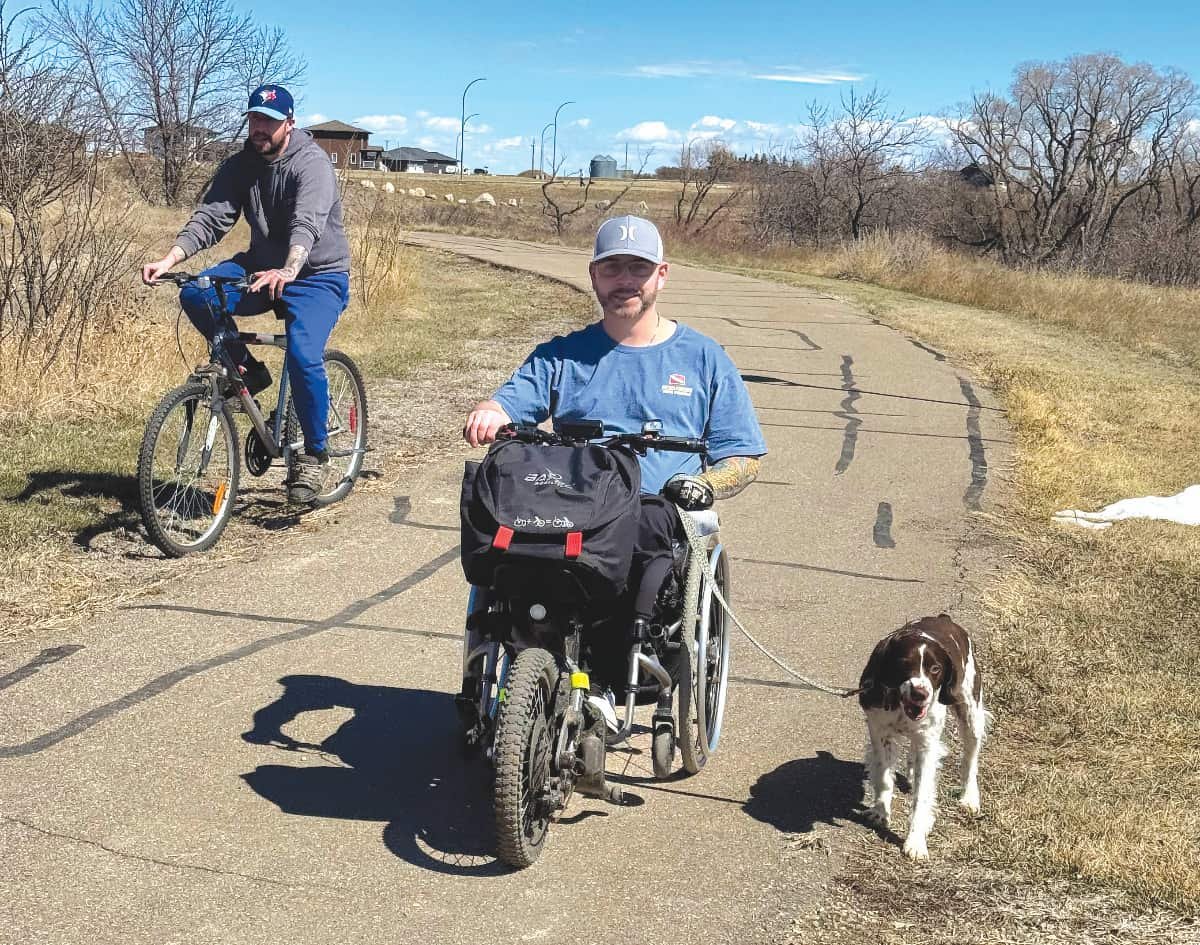 Ryan Orton (centre) enjoyed a gorgeous afternoon on the Kindersley walking trail with his friend Kyle Anderson (on bike) and his pal Munroe the dog, making the most of a break in the weather.