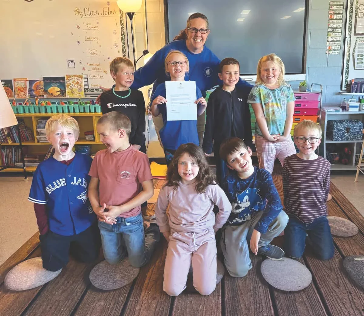 Erin Pincemin and the Grades 1-2 class at Westcliffe Composite School celebrate the Saskatchewan Government Playground Grant.