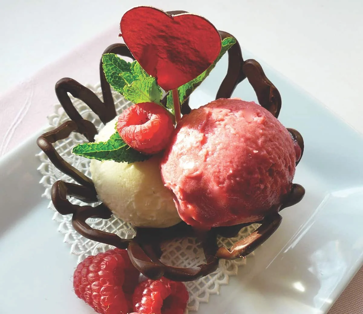 To serve, place the baskets on individual serving plates and fill with fresh berries, fruit, and a scoop of raspberry sorbet or your favorite ice cream.