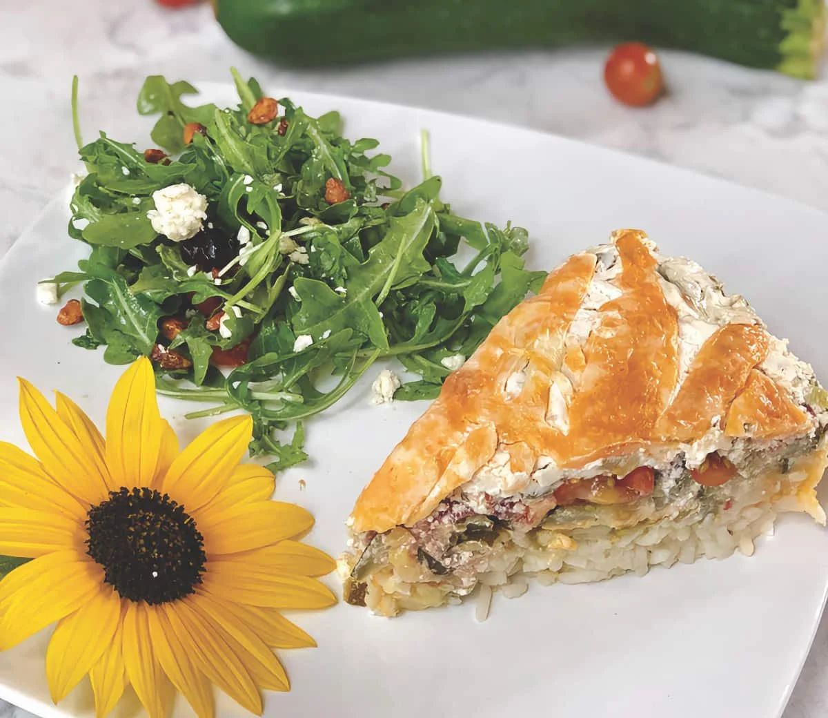 To assemble: Spoon the cooked rice for a base layer in the casserole. Spread chiles evenly over the rice, then sprinkle half of the cheese. Place zucchini slices evenly over cheese, then add a layer of tomato slices.