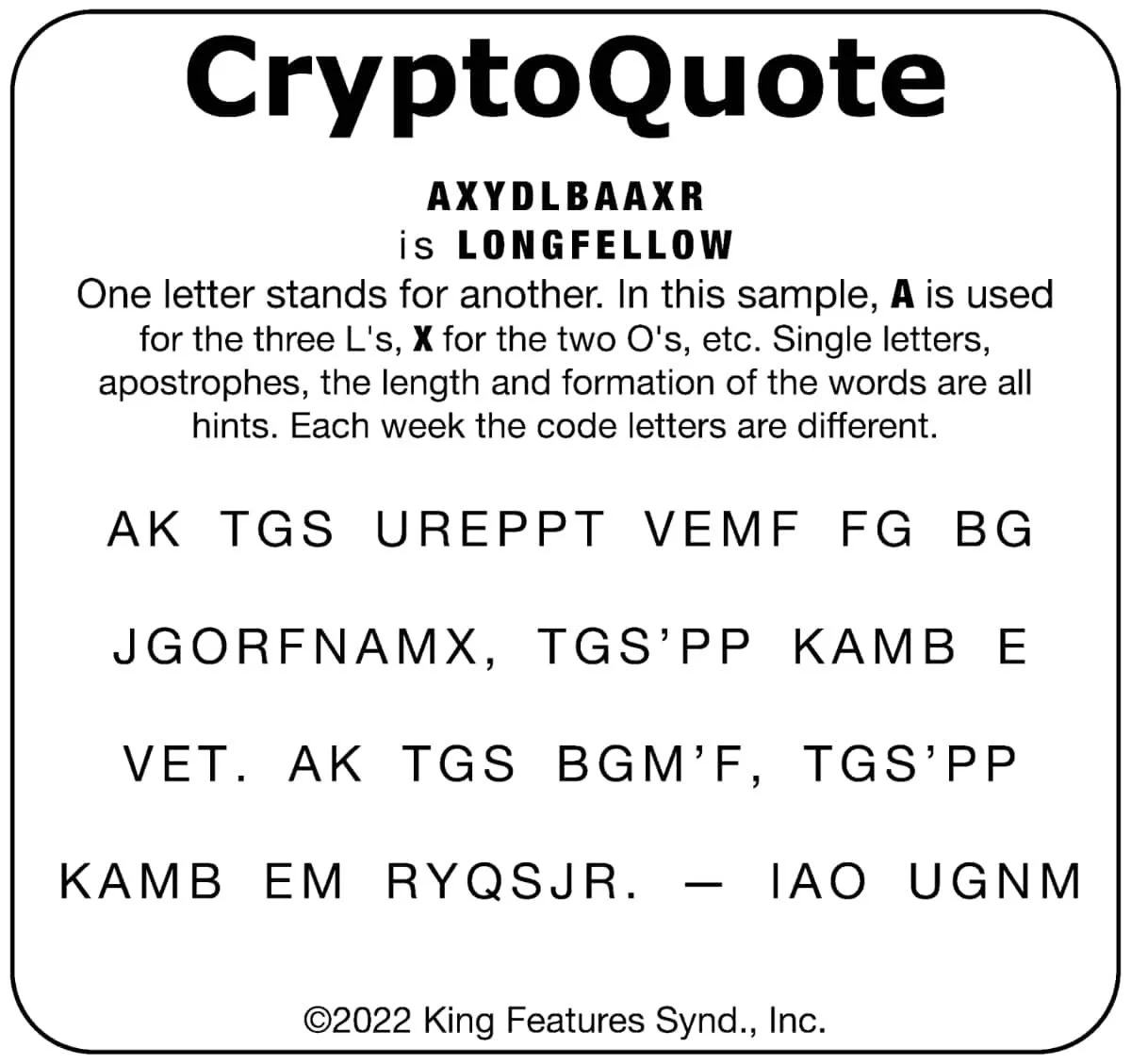 CryptoQuote: Nov 23 Fun & Games Nov 23 Written By The Weekly Bean Have fun breaking the CryptoQuote! Each week the code letters are different. The Weekly Bean