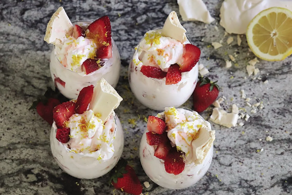 To serve, evenly divide the Eton Mess mixture between 6 coupes, short glasses or small bowls. Top each serving with the remaining strawberries and a sprinkle of lemon zest for extra zing.
