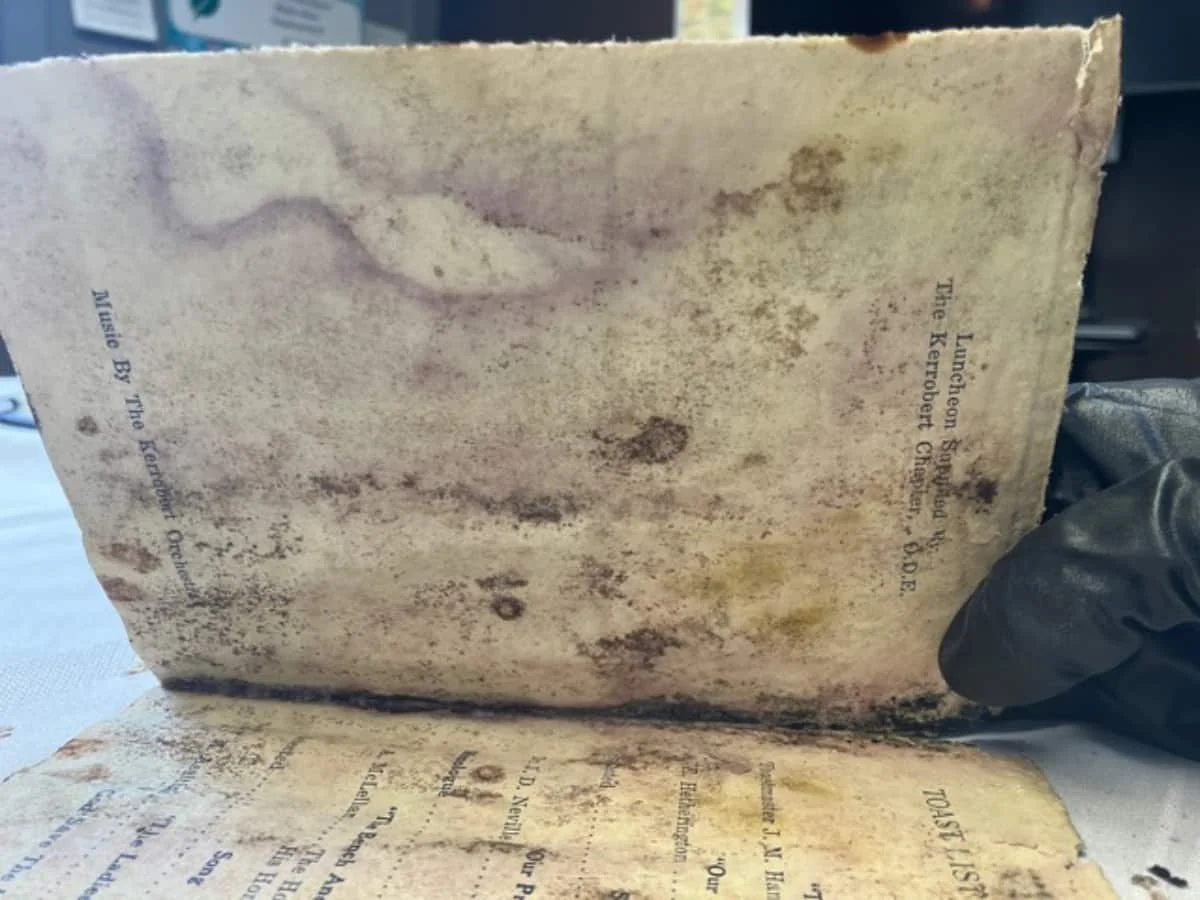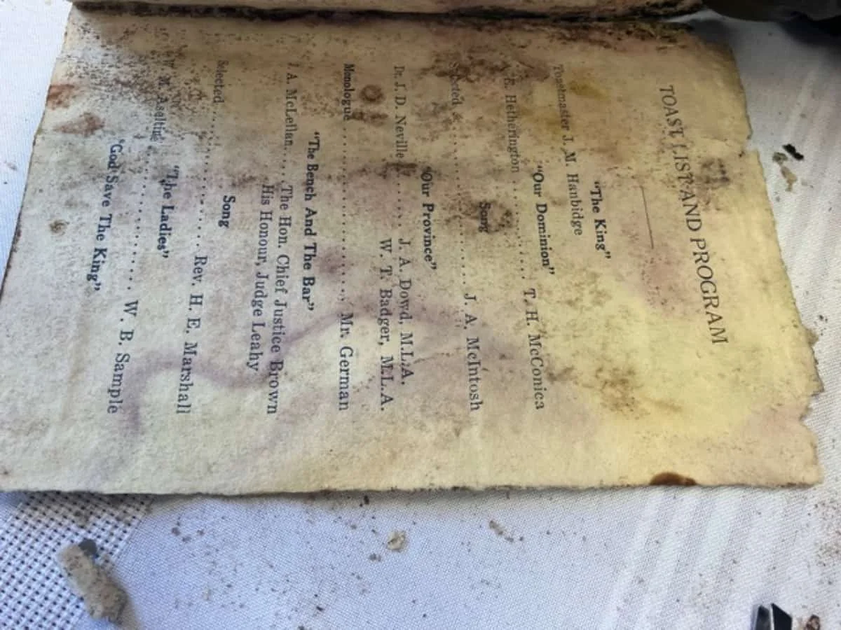 Unfolding each piece of paper took an entire day’s worth of work. We began with the program from the Kerrobert Bar Association’s banquet. The inside revealed a legible description of the program, including the songs played as well as some of those who were attending.