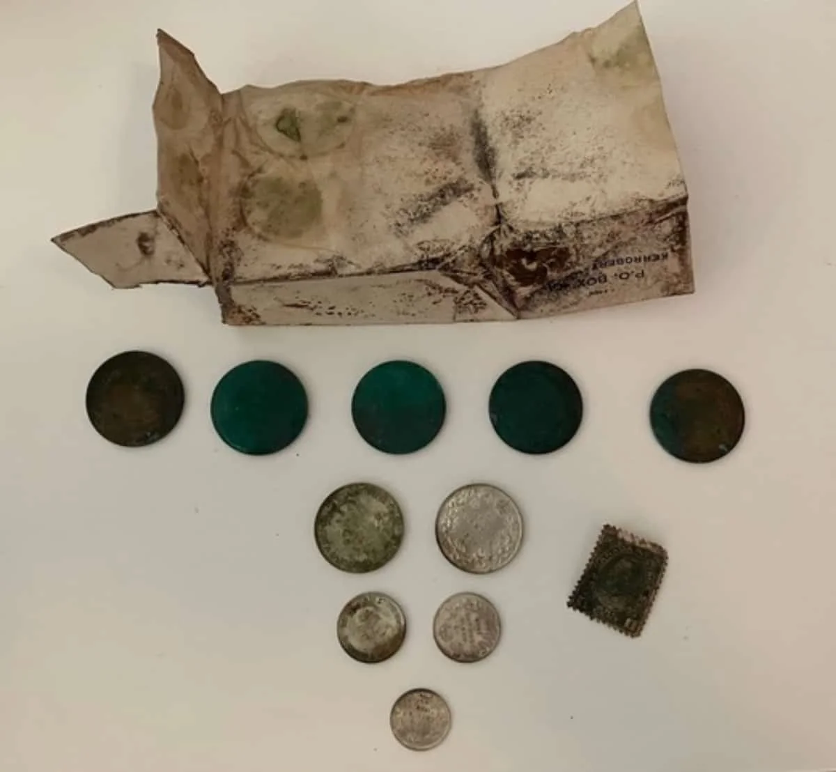 After this, we moved on to the stack of newspapers, a very daunting task judging by its size. We first removed the top booklet to find an envelope of coins sitting underneath. The envelope revealed five pennies, two quarters, two dimes, and a five-cent coin which was even smaller than the dime. Our Google search showed us that in Canada, the five-cent coin was only made from nickel starting in 1922. After the coins, we were able to peel back the stamp, which was stuck to the newspaper, revealing a depiction of King George V on the green background of the one-cent stamp.