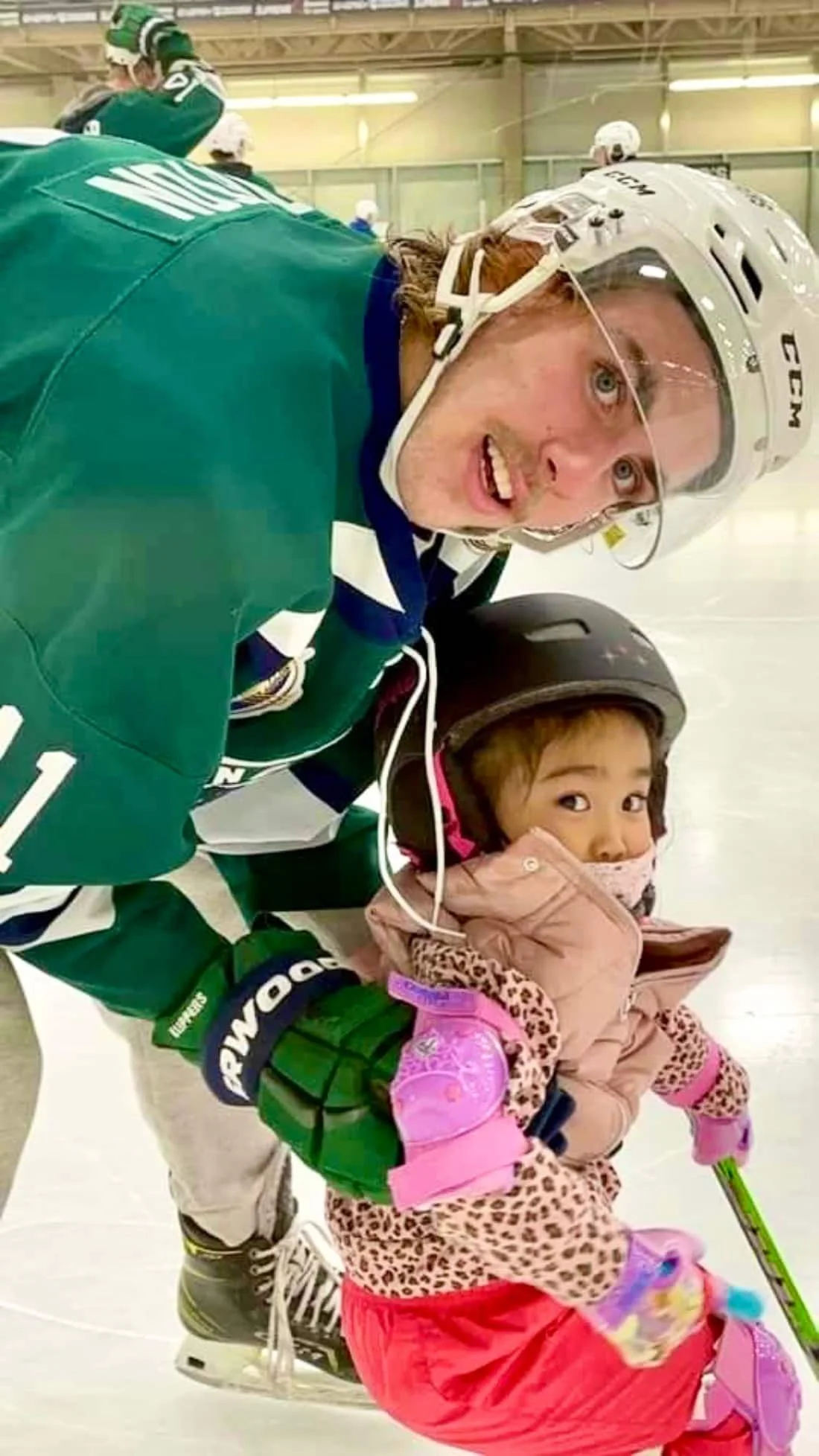 The Kindersley Jr. Klippers had a fun skate with students from the Kindersley Playschool on February 15 and 16. Pictured are Josh Morton and Carlyn Maligaya.