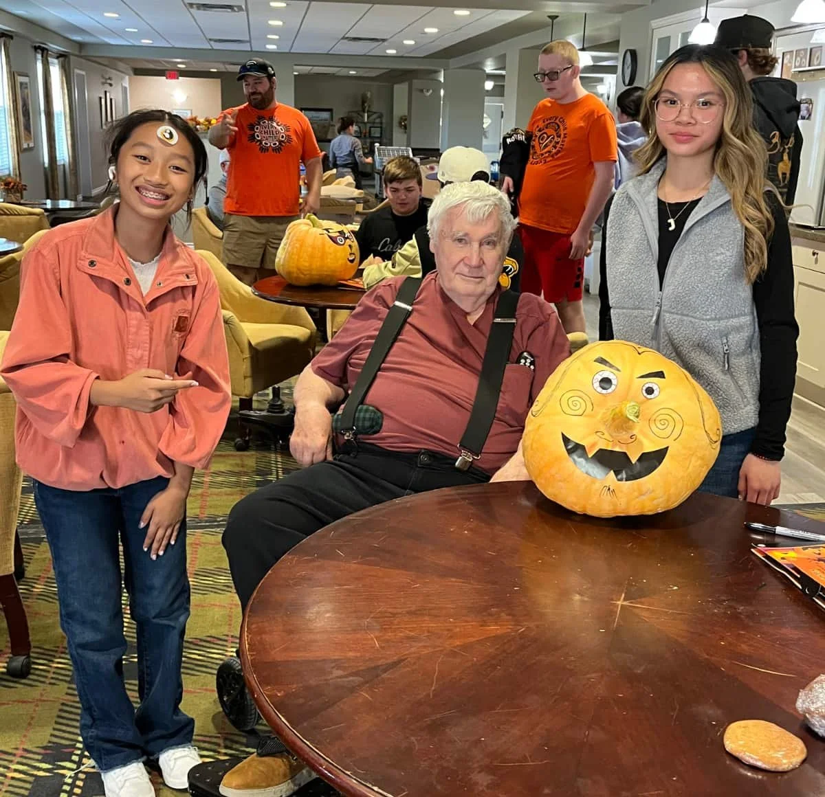 Nancy expressed sincere appreciation for Cathy Cox’s generous donation of fifteen pumpkins which she grew in her garden. Thanks to the artistic talent of KCS students and the residents of Caleb, those pumpkins are now wearing a variety of smiling, serious and silly faces to brighten Caleb’s decor. The students not only got a lot done, but more importantly the seniors enjoyed visiting and spending time with the teens.