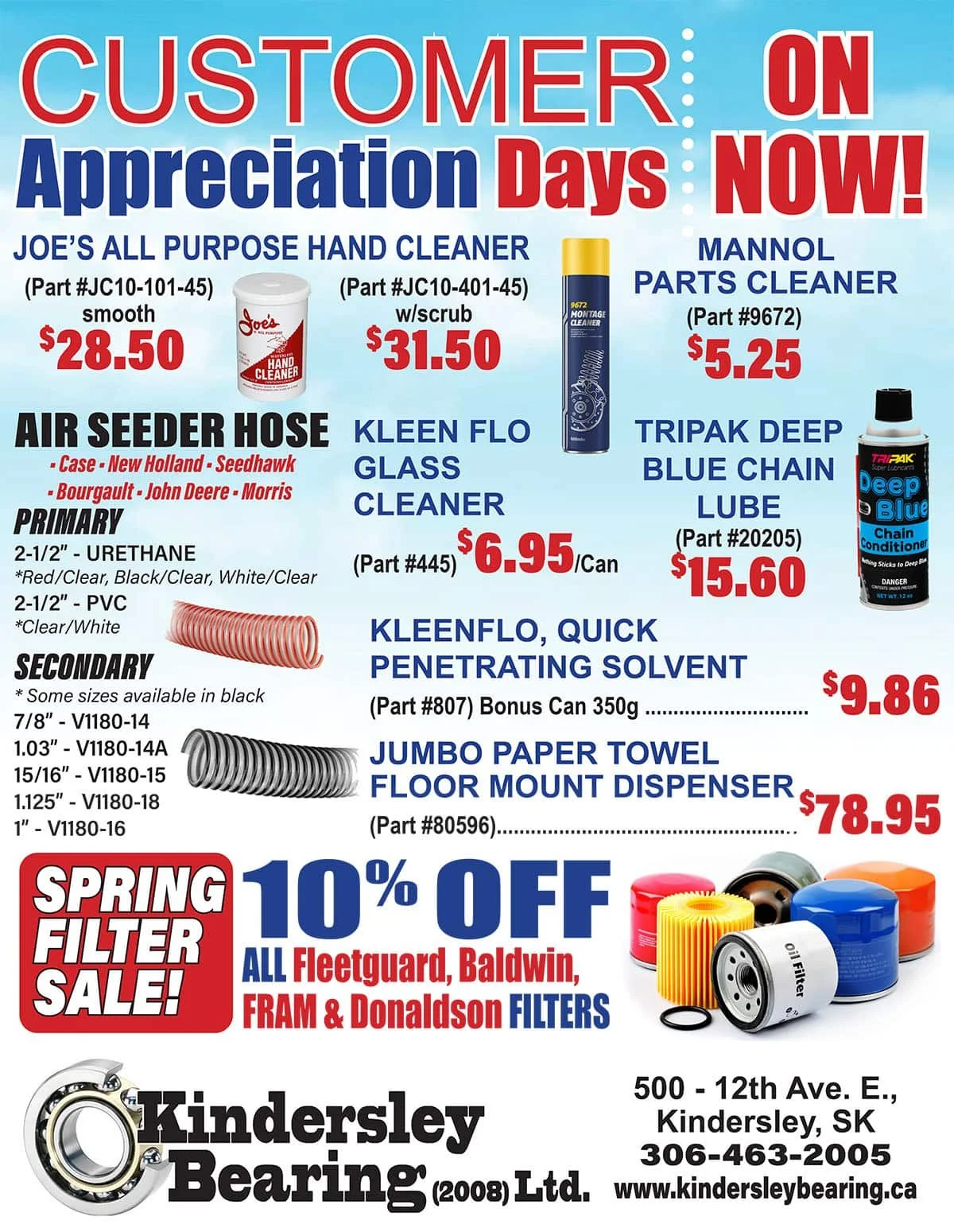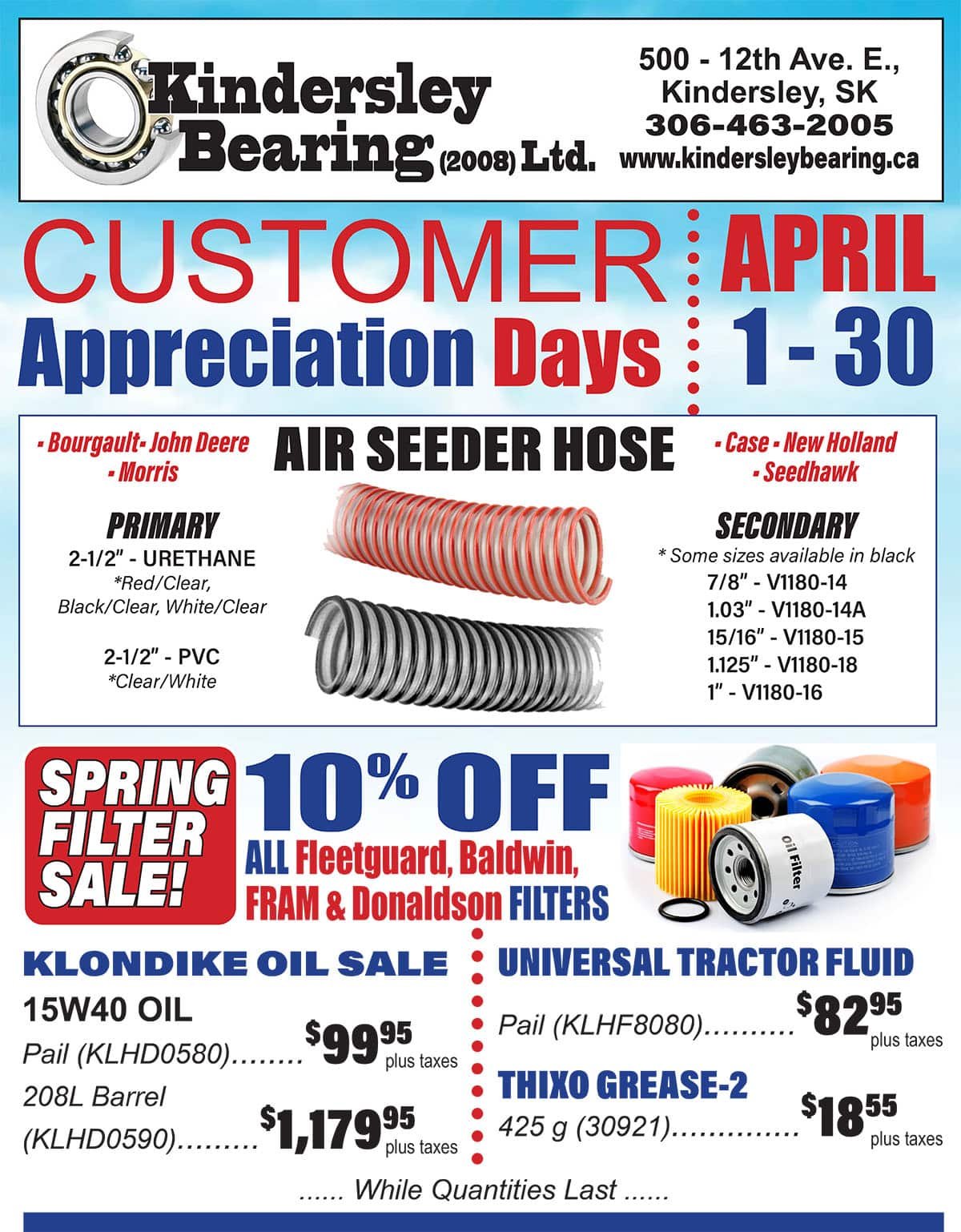 Sponsored Article: Customer Appreciation Days are on now at Kindersley Bearing, running from April 1 to 30. Come check out all the sales at Kindersley Bearing over the month of April. We have a combined 80 years of excellence in the agriculture and oil industry.