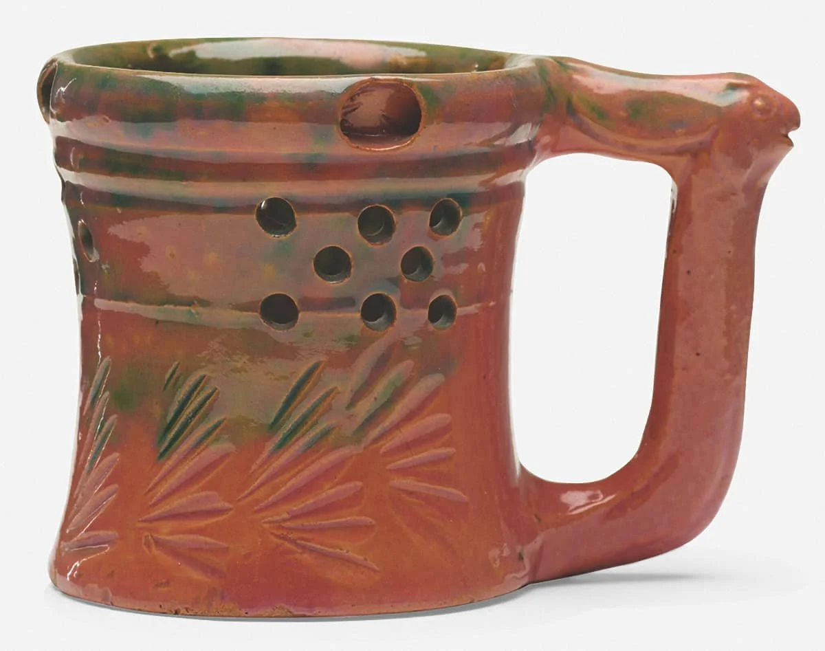 Collecting ceramics may be seen as traditional, even old-fashioned, but there is plenty of room for eccentricity. This puzzle mug by George E. Ohr is an unusual piece by an unconventional artist. There are holes in its sides; if you try to fill it and drink from it like an ordinary mug, the liquid spills out -- probably onto you. Puzzle mugs usually have a hollow portion, often in the handle, that works like a drinking straw. The trick is to know which holes to cover and which to drink from.