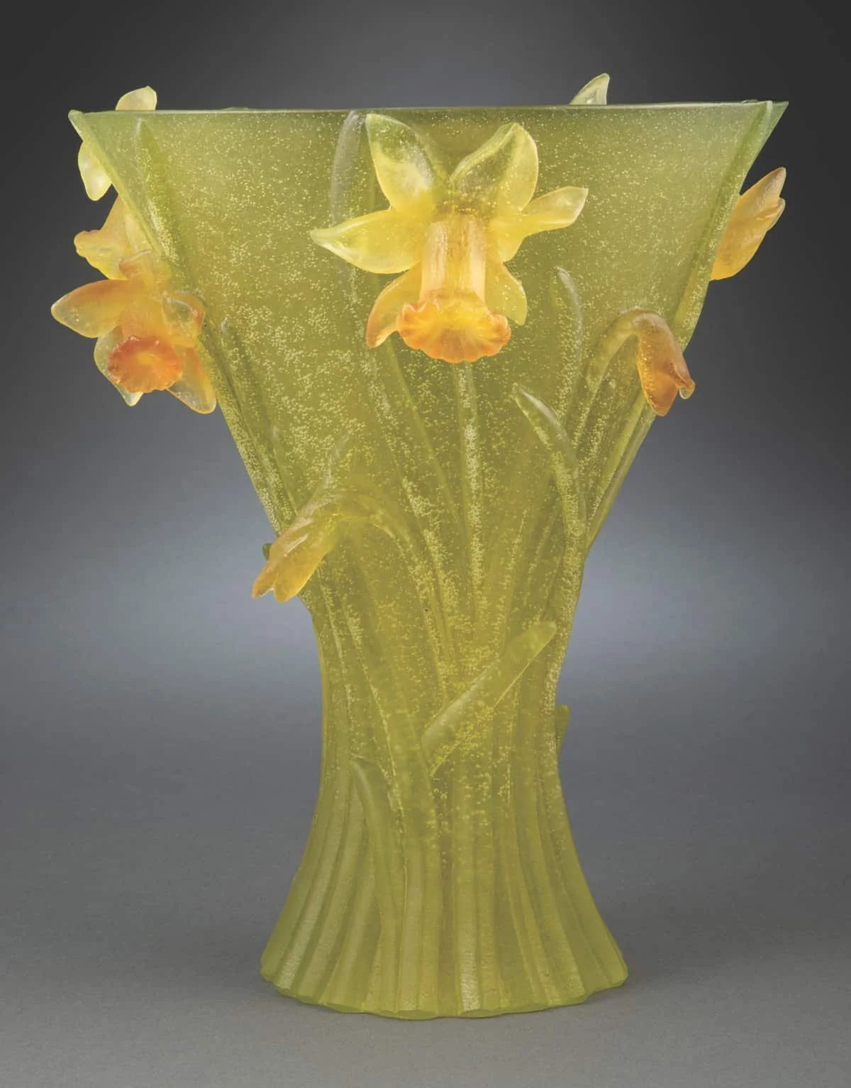 Glassworks like Daum made pate-de-verre pieces with three-dimensional flowers. They are often valuable today. This Daum vase made to look like a bunch of daffodils sold for $2,125 at Heritage Auctions.