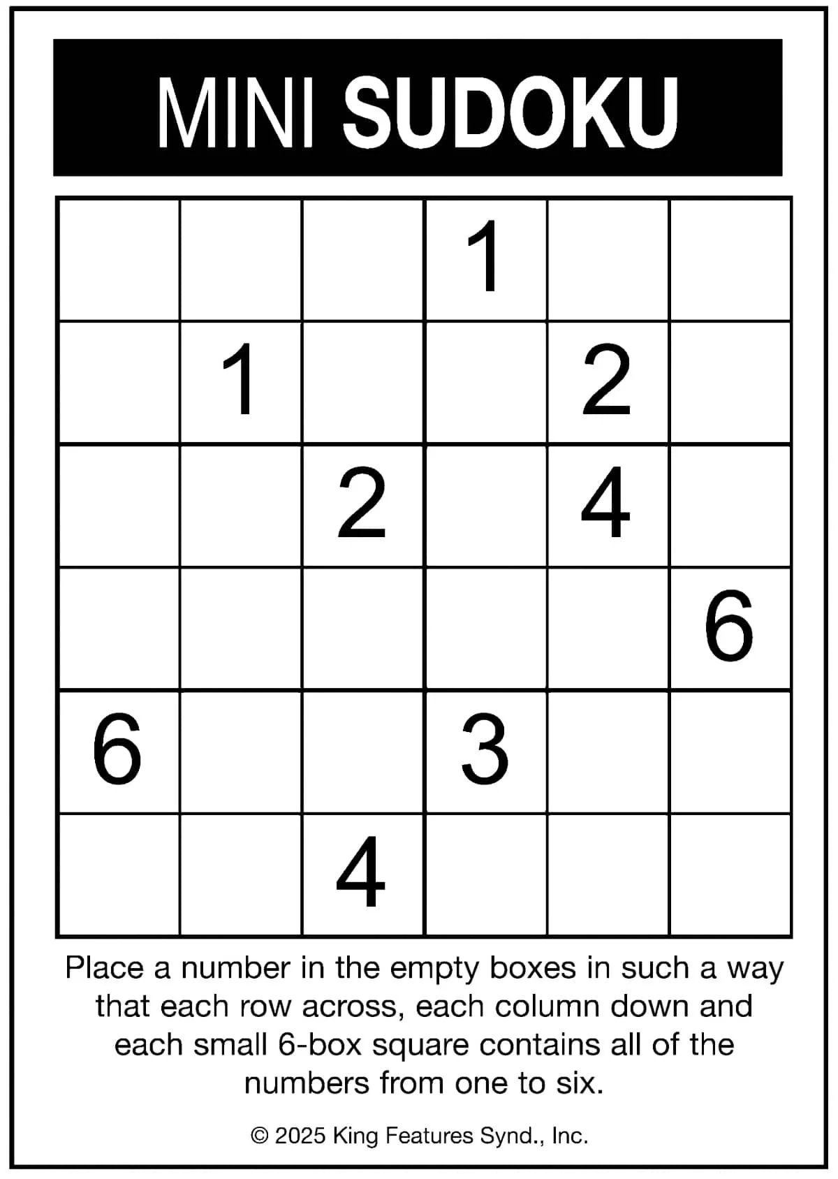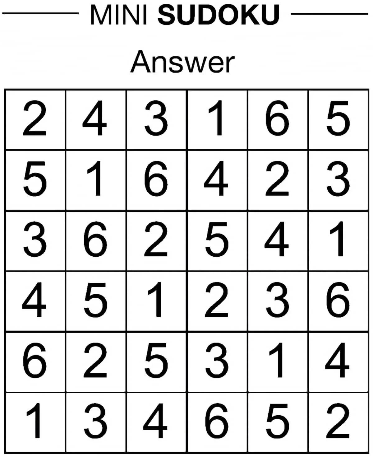 Place a number in the empty boxes in such a way that each row across, each column down and each small 6-box square contains all of the numbers from one to six.
