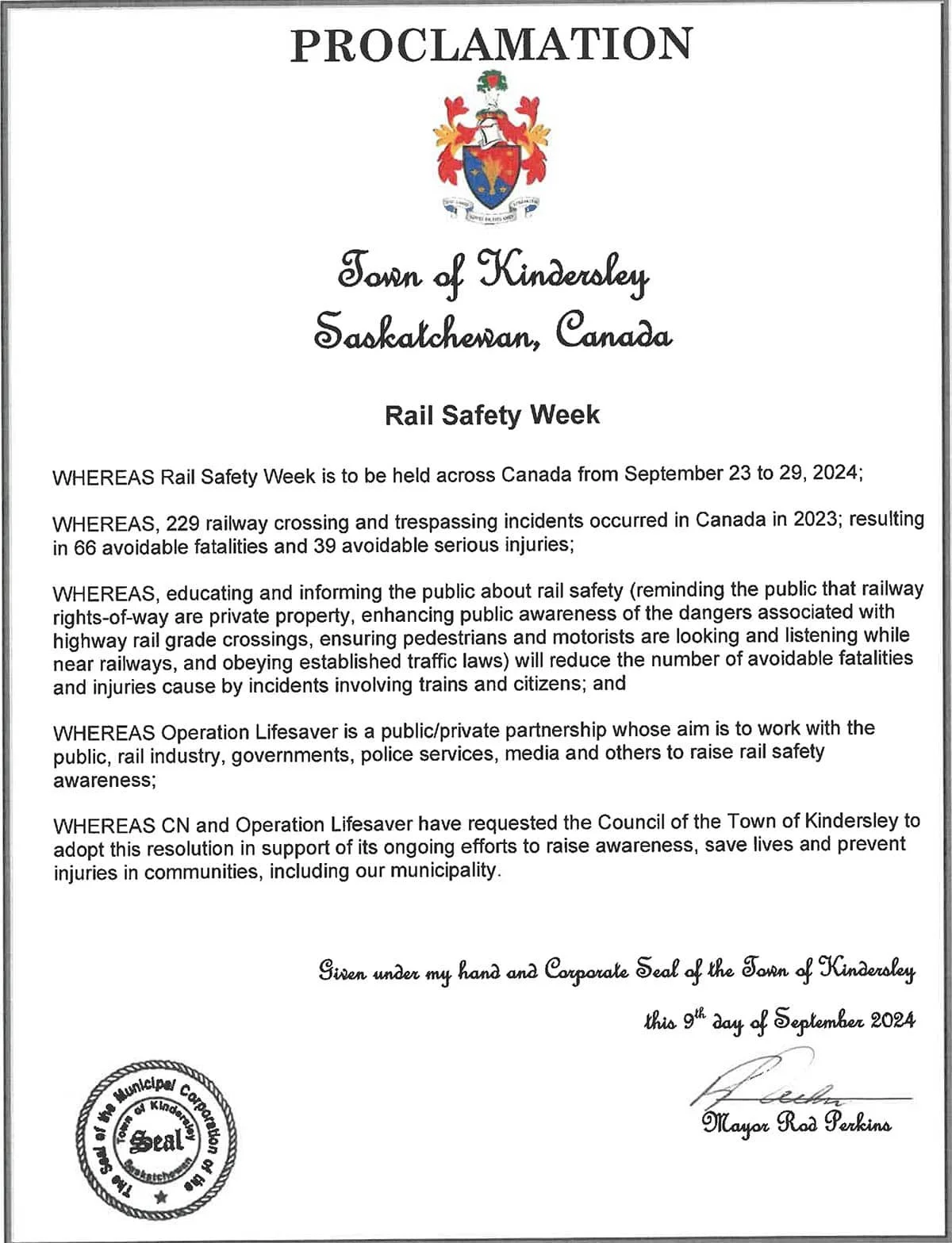 Given under my hand and Corporate Seal of the Town of Kindersley this 9th day of September 2024. Mayor Rod Perkins.