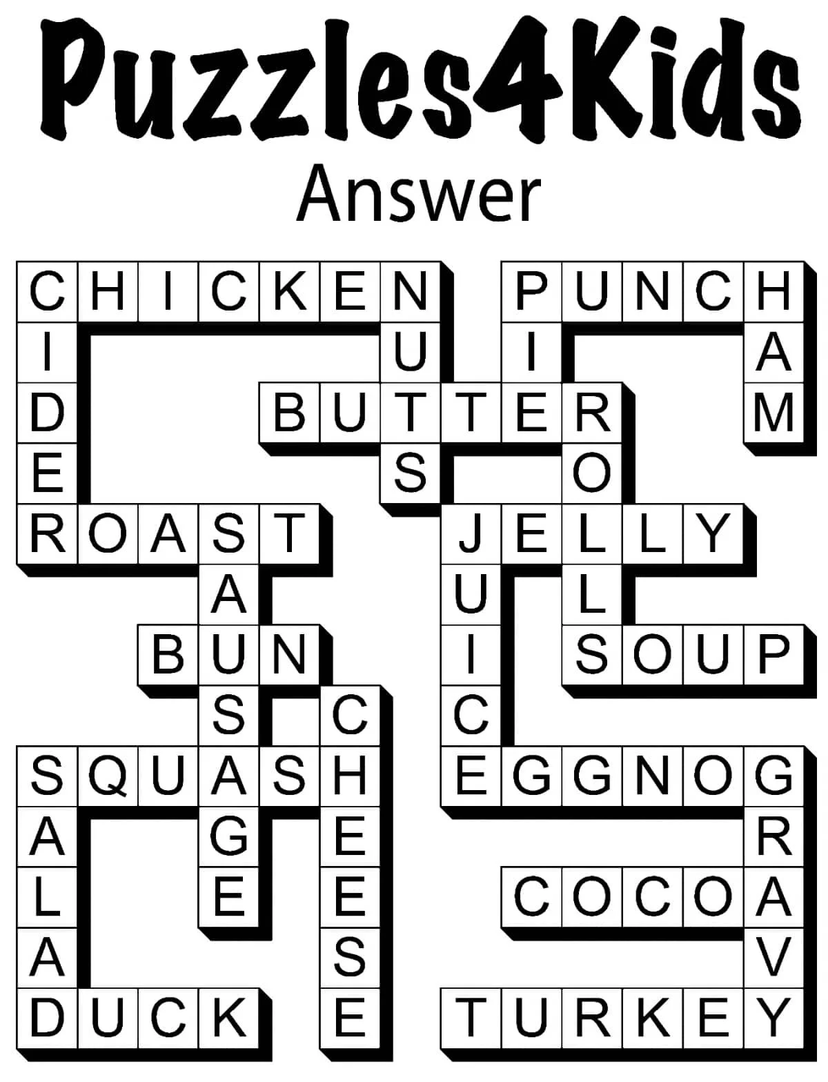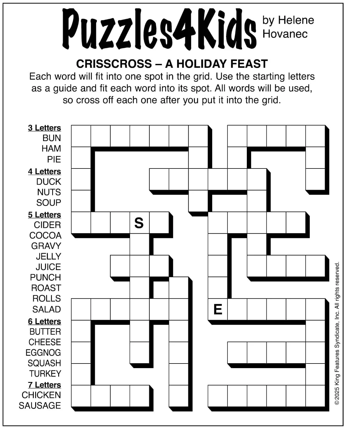 Crisscross - A Holiday Feast. Each word will fit into one spot in the grid. Use the starting letters as a guide and fit each word into its spot. All words will be used, so cross off each one after you put it into the grid.