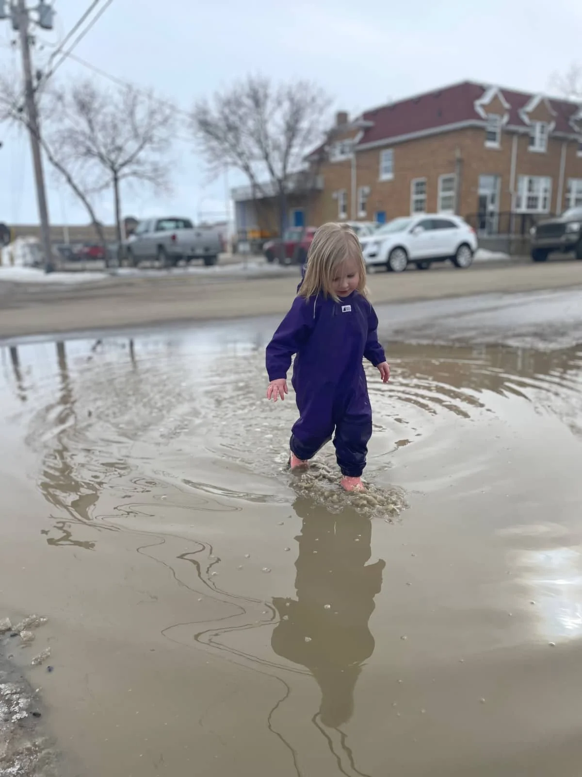 This little girl was having a great time trying out her new rubber boots. Only in Saskatchewan are kids able to enjoy sledding on mounds of snow and splashing in puddles, all on the same day.