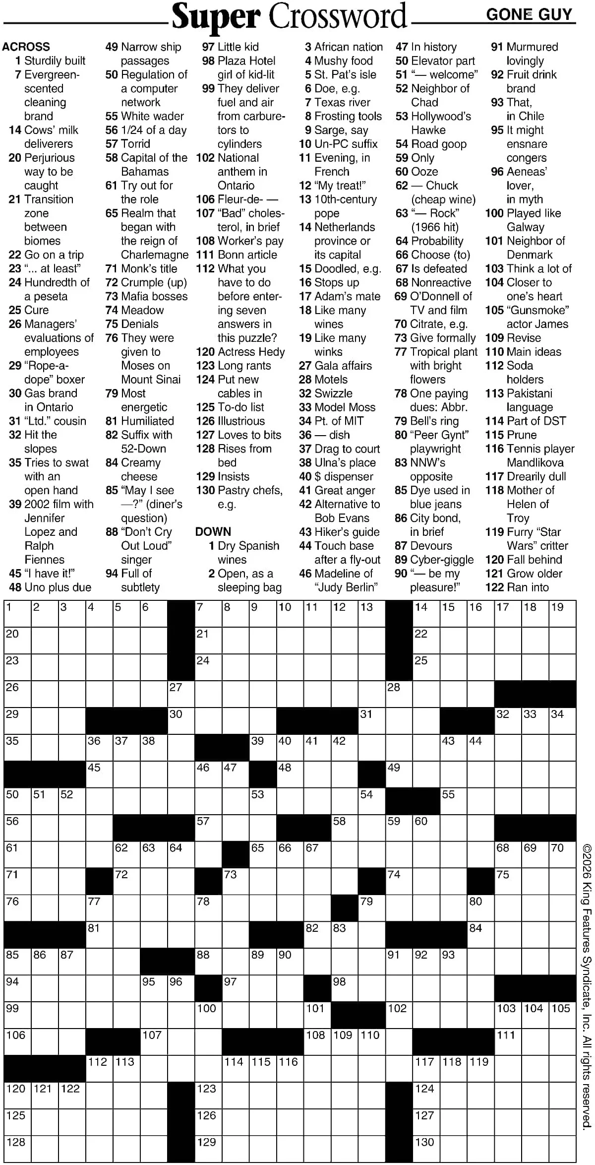 Super Crossword: Gone Guy Fun & Games Apr 23 Written By Your West Central Voice Give your brain a workout with our super crossword! Answers below: Don’t cheat! :) Your West Central Voice