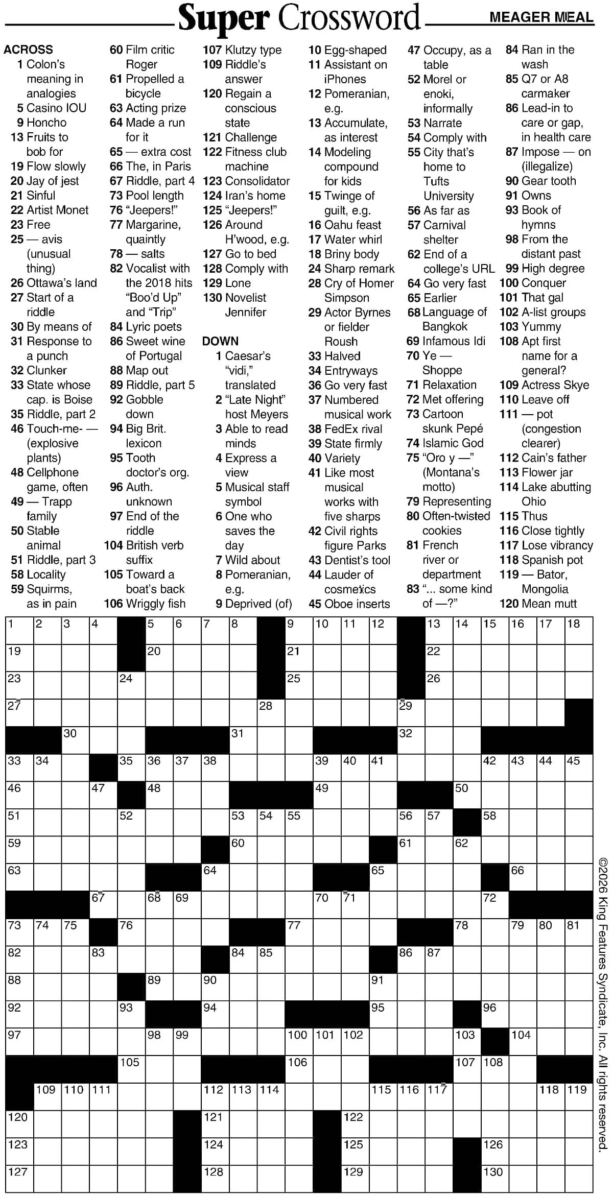 Super Crossword: Meager Meal Fun & Games Mar 26 Written By Your West Central Voice Give your brain a workout with our super crossword! Answers below: Don’t cheat! :) Your West Central Voice